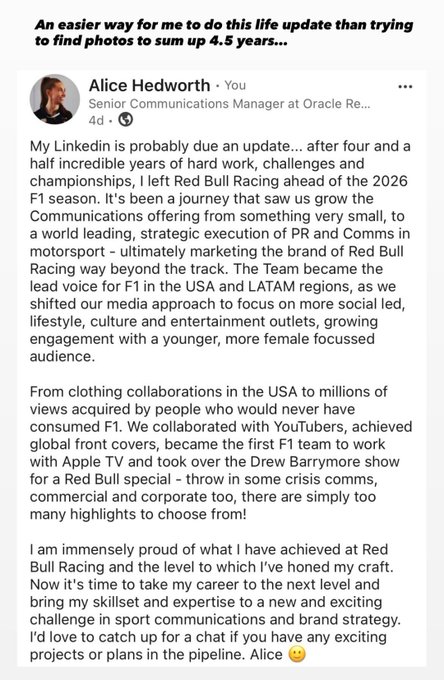 Alice Hedworth, Senior Communications Manager has announced her departure from Red Bull Racing after 4.5 years with the team. Mark Mateschitz (49%): Chalerm Yoovidhya (51%): Who could the problem be? Will the last person out, please turn off the lights |